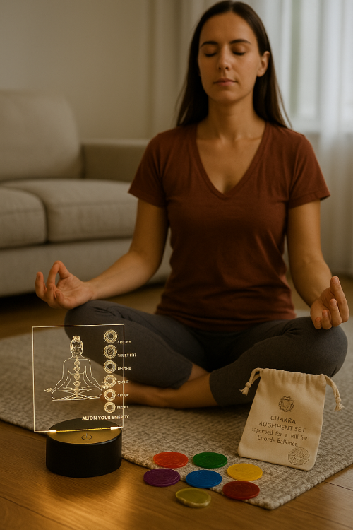 - Chakra Healing Set with Lamp – Includes an LED light featuring the seven chakra symbols + 7 engraved acrylic talismans for full energetic alignment.