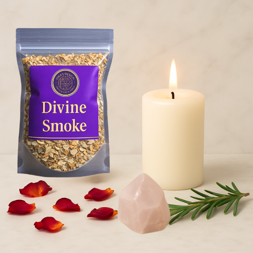 Divine Smoke is a handcrafted spiritual protection ritual incense blend created to shield your energy and bless your path. Crafted with sacred herbs, resins, and roots known for their protective and purifying properties, this blend removes negativity while infusing your space with divine light. Perfect for protection rituals, blessings, or spiritual ceremonies, its aromatic smoke creates a sacred shield that supports your highest vibration. Burn over charcoal during meditation, before important events, or when you feel the need for spiritual reinforcement. Each batch is made in small quantities, charged with intention, and presented in mystical packaging, making Divine Smoke both a powerful ritual tool and a beautiful gift.