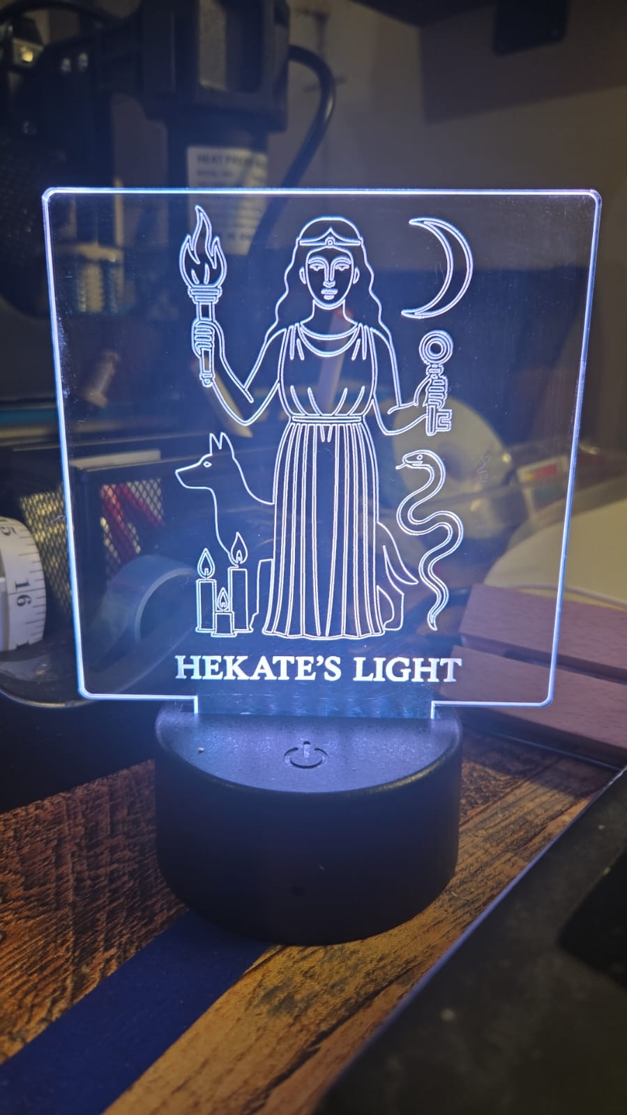 Featuring a powerful line-art engraving of Hekate holding her torch and key, accompanied by sacred symbols like the crescent moon, dog, snake, and ritual candles, this lamp brings protection, guidance, and clarity to your rituals. The soft glow (available in multiple colors) makes it perfect for altars, moon spells, shadow work, or night meditations.