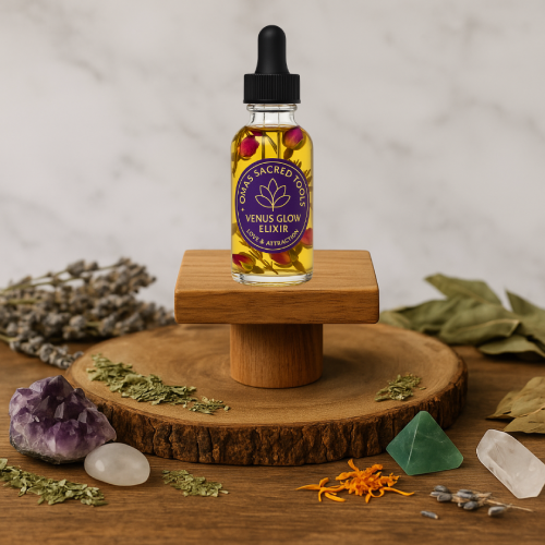 Venus Glow Elixir is your ritual companion for love, sensuality, and magnetism. Made with rose petals, damiana, hibiscus, and rose quartz, this oil opens the heart and amplifies romantic attraction.